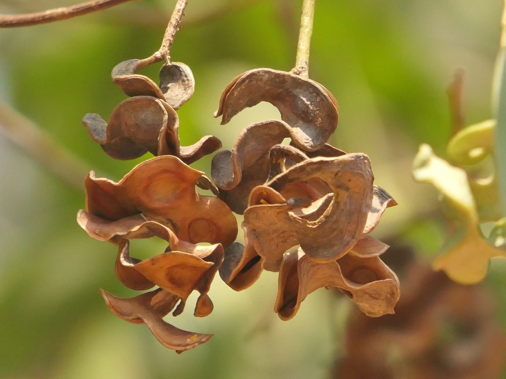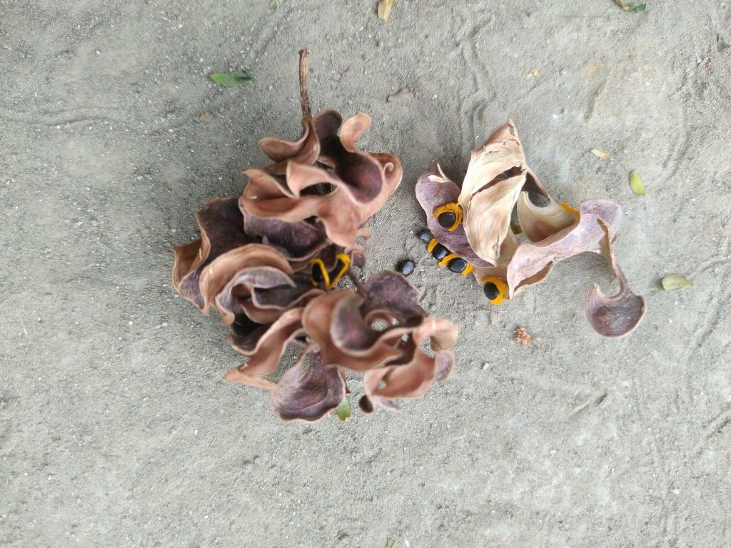 - Buah berupa polong pipih memanjang, berwarna cokelat saat matang, Mengandung beberapa biji kecil berwarna cokelat kehitaman.