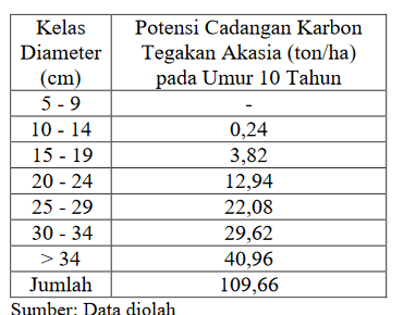 Potensi serapan karbon pohon akasia per tahun berkisar antara 20 hingga 35 kg CO₂ per pohon, tergantung spesies, umur, dan kondisi tumbuh. Spesies seperti Acacia mangium (usia 1-5 tahun ; 20–30 kg CO₂/tahun) menunjukkan serapan yang lebih tinggi pada usia produktif daripada spesies Acacia auriculiformis (1-5 tahun ; 15–25 kg CO₂/tahun)