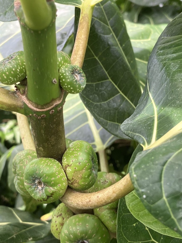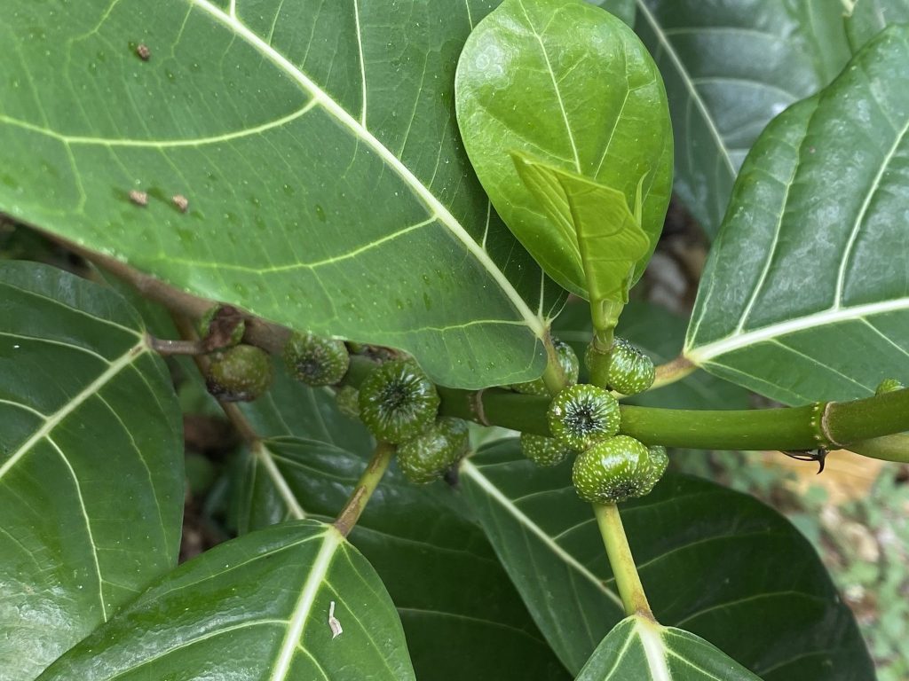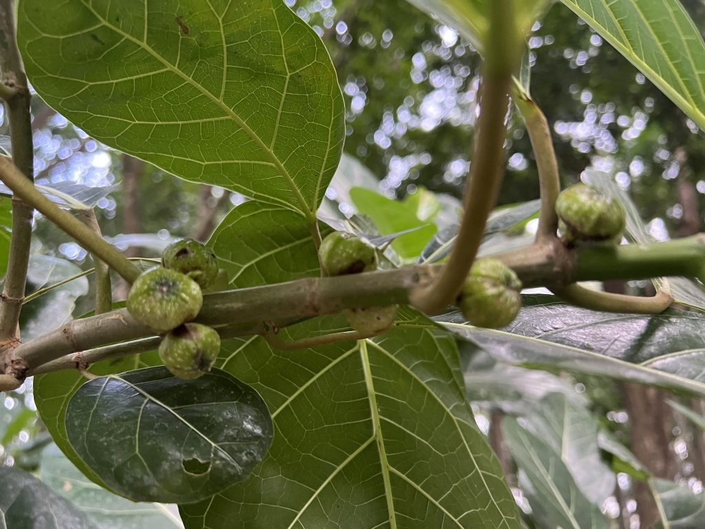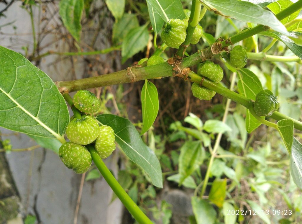 - Bunga/Buah/Ara: Berbentuk bulat atau agak pipih. Buah (Ara)/Berusuk (ridged) ini muncul dari ketiak daun di sepanjang dahan (ramiflorous). Buah matang secara bertahap satu per satu dari hijau menjadi kuning kehijauan untuk memastikan satwa penyebar seperti musang dan kelelawar kembali setiap malam.