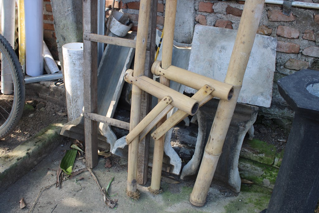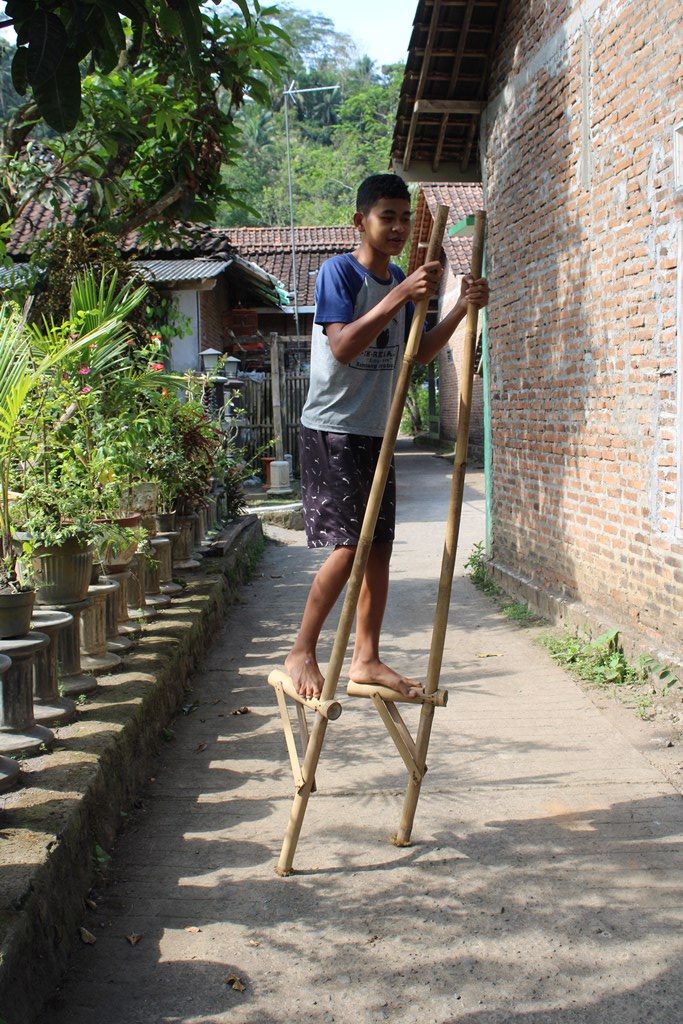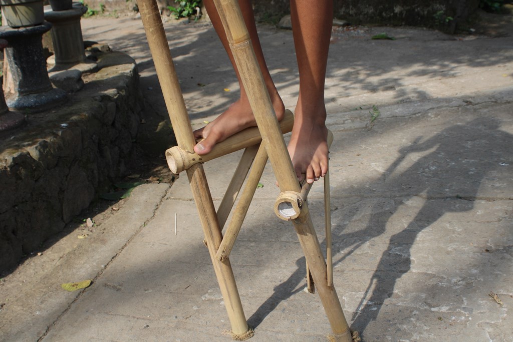 Egrang merupakan salah satu permainan tradisional berbahan dasar bambu. Tongkat yang terbuat dari sepasang buluh bambu ini memiliki panjang yang bervariasi, sesuai kreasi dan kebutuhan. Bambu yang dipakai memiliki panjang kurang lebih 2,5 – 3 m dan berdiameter sekitar 6 – 9 cm. Pada ukuran kurang lebih 50 cm dari ujung bawah bambu, dipasang sebuah ruas bambu pendek pada masing-masing tongkat sebagai tempat pijakan kaki. Saat seseorang berdiri di pijakan kaki dan mulai berjalan menggunakan egrang, secara otomatis posisi orang tersebut berada lebih tinggi dibanding sekitarnya.