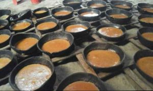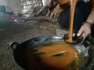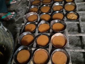 Salah satu penanda masakan nira sudah menjadi gula dan siap dicetak adalah perubahan warna menjadi coklat kemerahan. Adonan gula jawa yang masih panas kemudian dituang ke dalam batok kelapa yang sudah tua. Tidak membutuhkan waktu lama untuk menunggu gula jawa mengeras. Gula jawa yang telah mengeras dan dingin kemudian dipindahkan ke tempat yang kedap udara sebagai salah satu upaya pengawetan dan kualitasnya tetap terjaga.