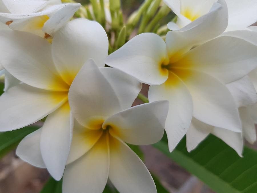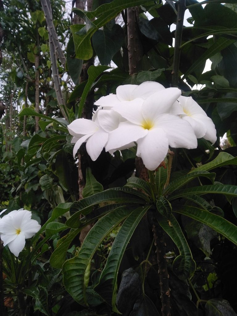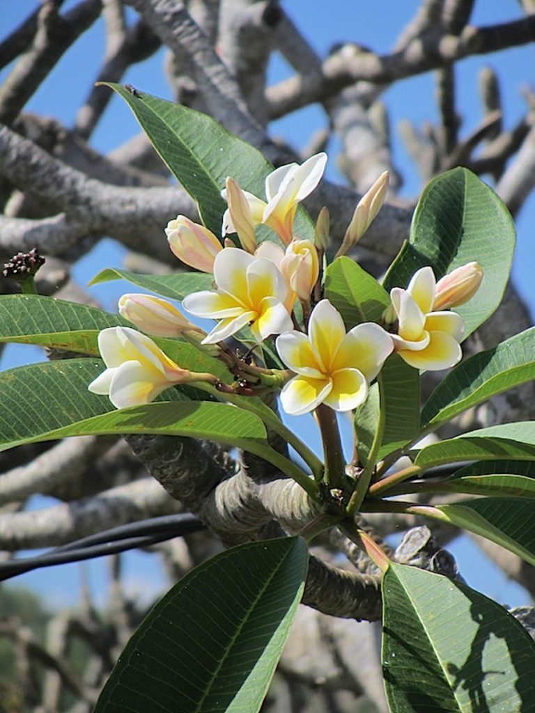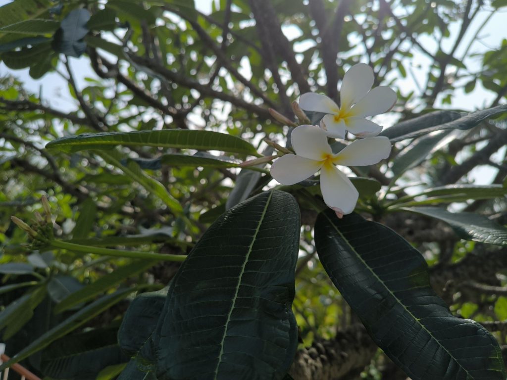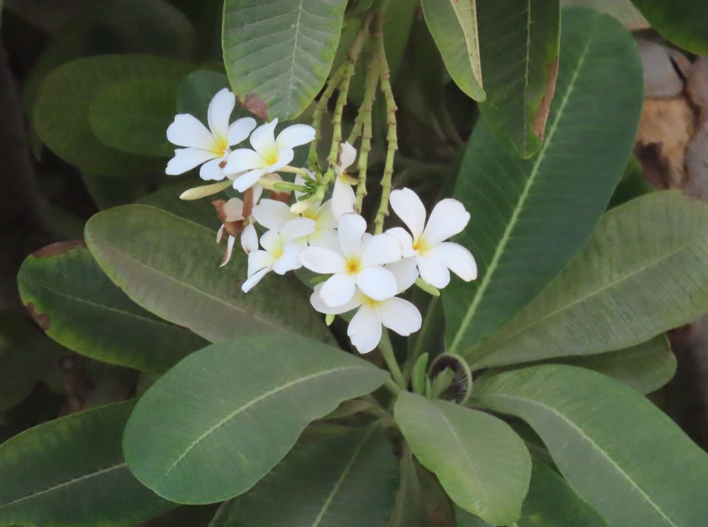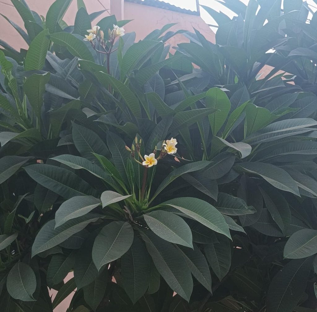 Daun berbentuk seperti sendok (spoon-shaped), bunga putih bersih. Bunganya hampir tidak beraoma, dan dikenal sebagai spesies plumeria yang paling tidak beraroma. - Plumeria stenopetala