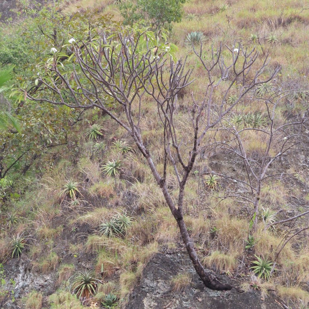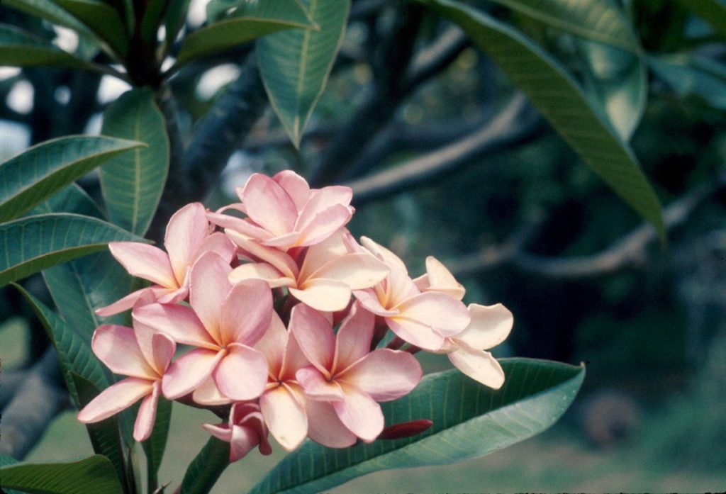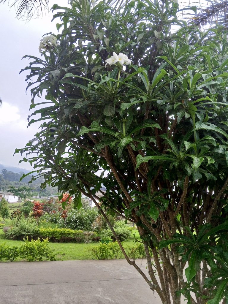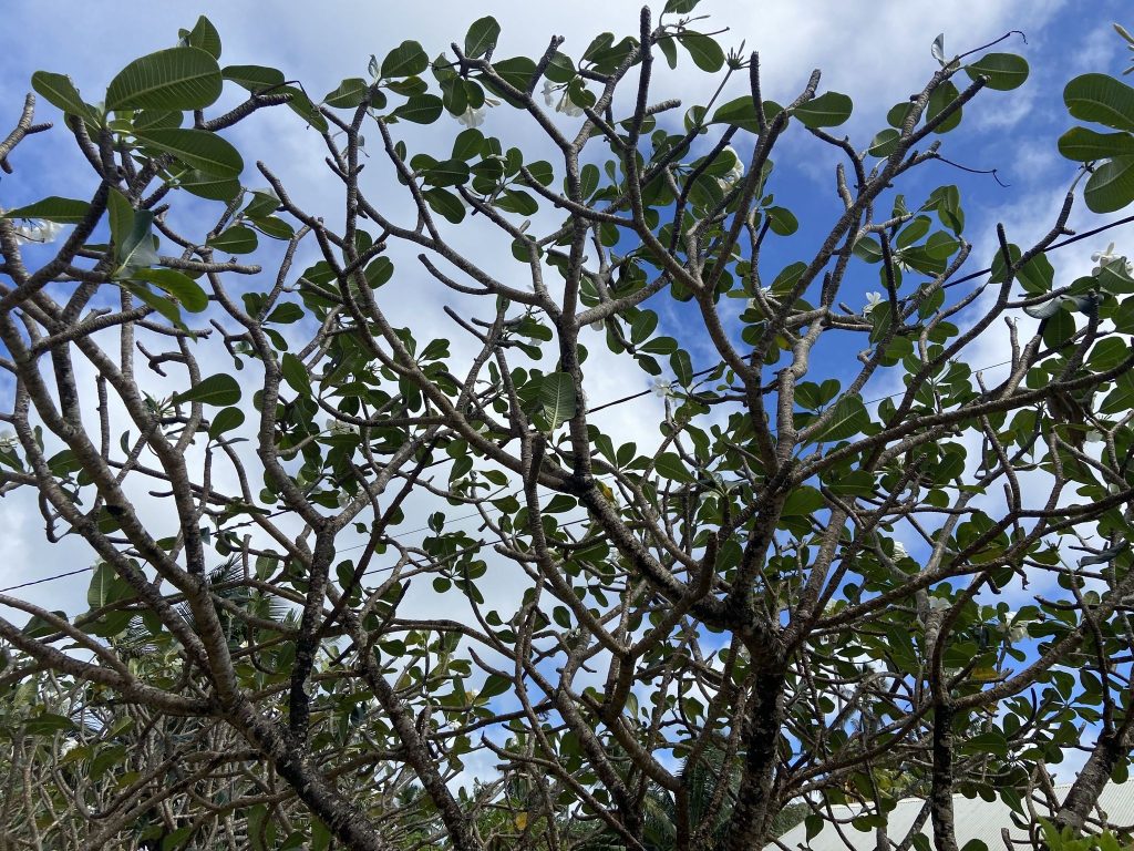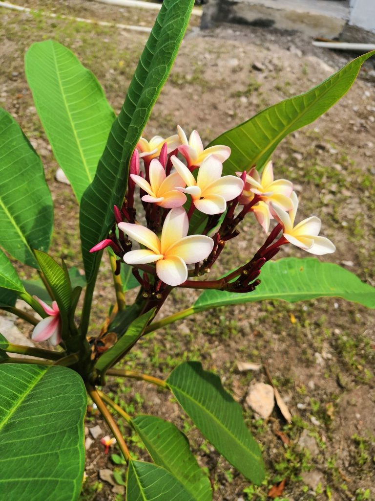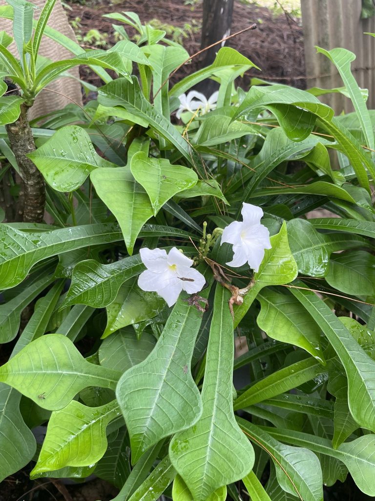 Daun berbentuk seperti sendok (spoon-shaped), bunga putih bersih. Bunganya hampir tidak beraoma, dan dikenal sebagai spesies plumeria yang paling tidak beraroma. - Plumeria stenopetala