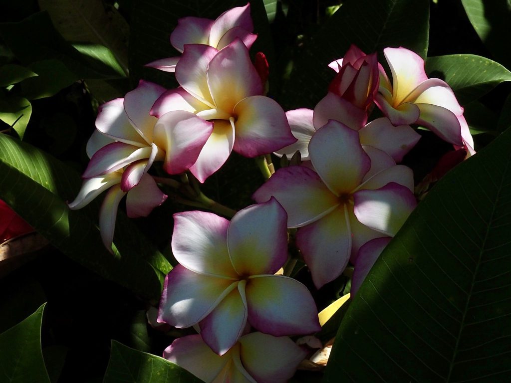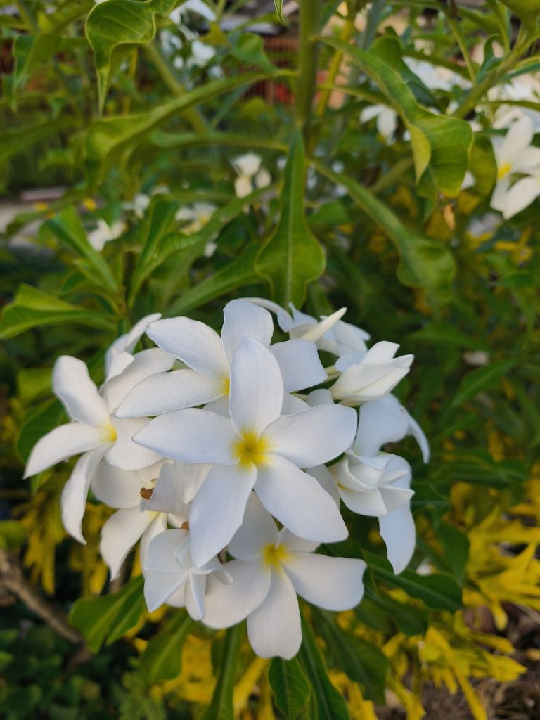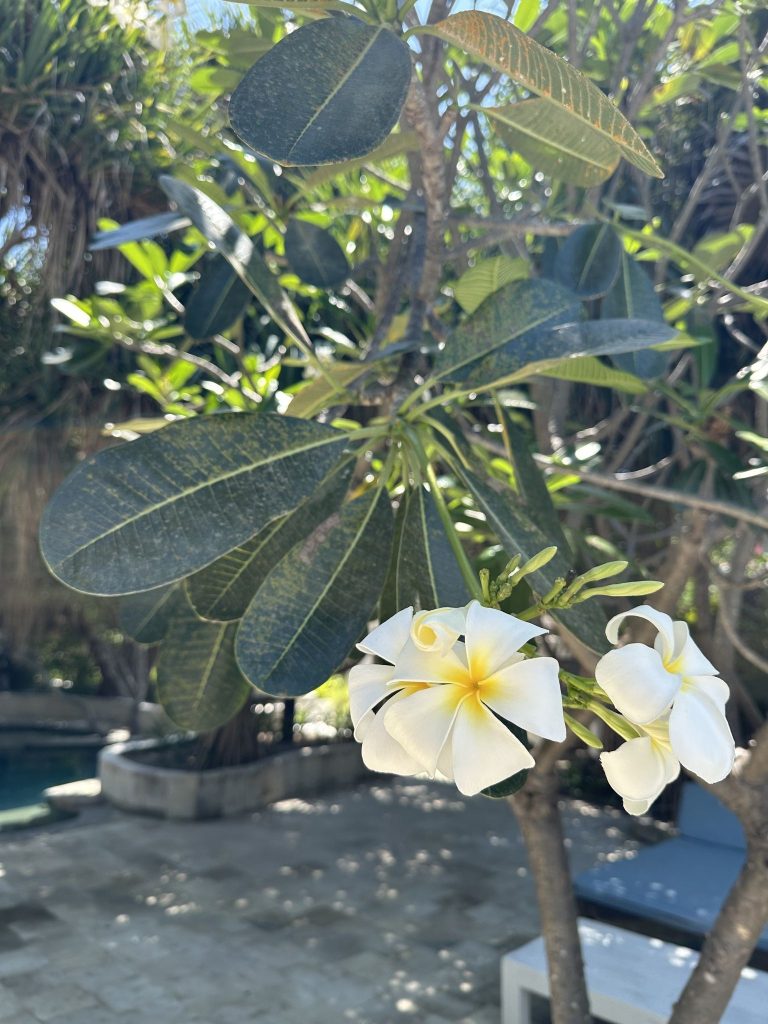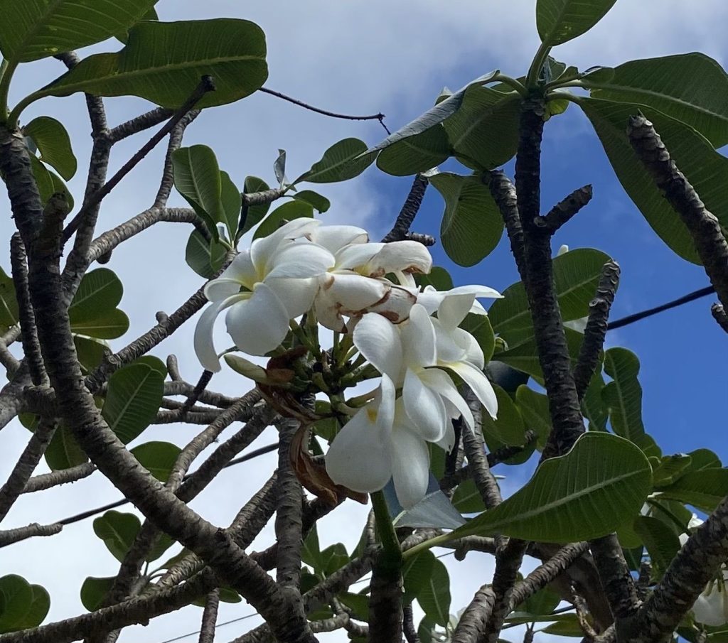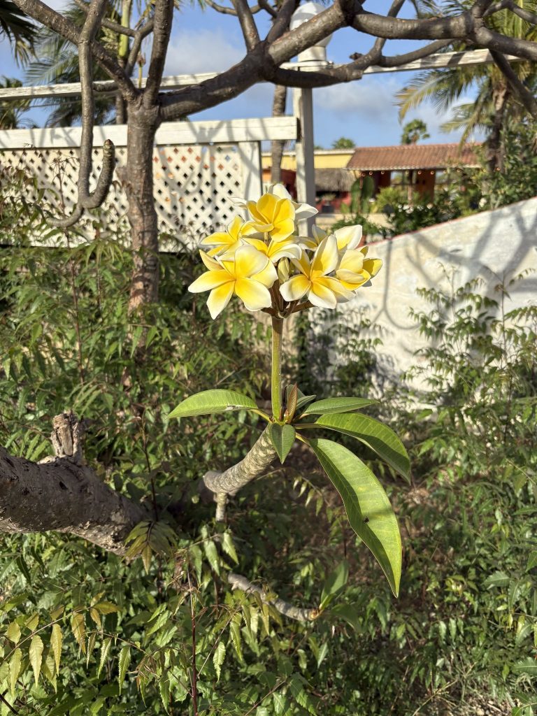 Daun berbentuk seperti sendok (spoon-shaped), bunga putih bersih. Bunganya hampir tidak beraoma, dan dikenal sebagai spesies plumeria yang paling tidak beraroma. - Plumeria stenopetala