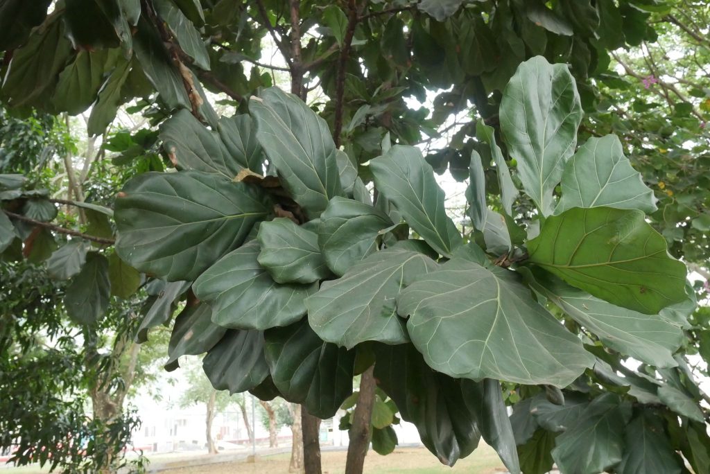 - Daun bertipe daun tunggal, tersebar (alternate). Ukuran: 20–45 cm panjang, 15–30 cm lebar dengan bentuk lyrate (seperti biola/kecapi) atau elips melebar di bagian ujung. Tekstur tebal, kaku (leathery). Permukaan daun bagian atas berwarna hijau tua mengkilap sedangkan bagian bawah lebih pucat dengan urat daun menonjol. Tepi daun bergelombang atau sedikit berlekuk dengan tangkai daun pendek (1–3 cm).