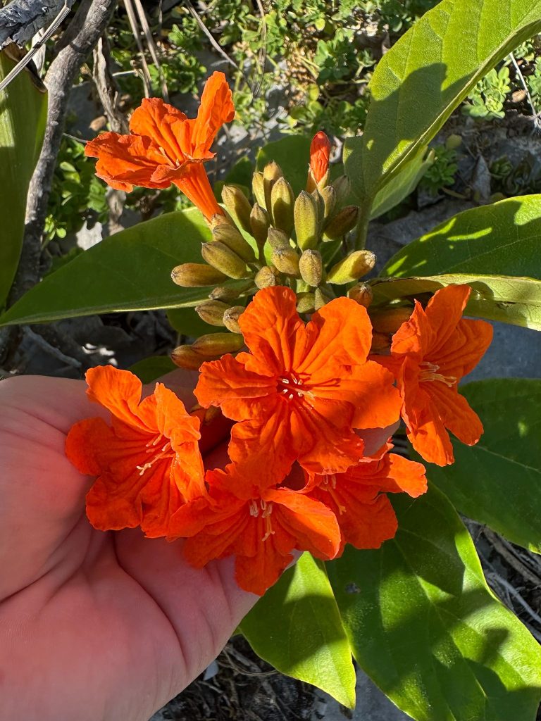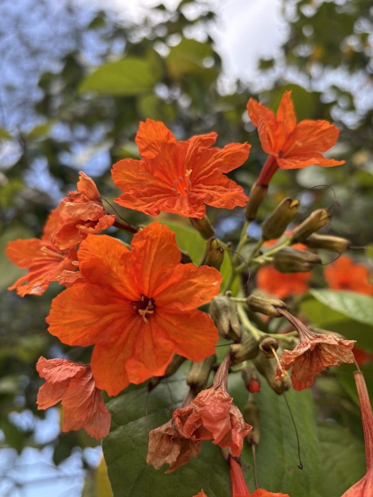 - Bunga berwarna oranye terang, mencolok. Berbentuk terompet dengan lima hingga tujuh kelopak menyatu. Bunga muncul di ujung cabang dalam kelompok (infloresens terminal). Bunga ini mempunyai daya tarik bagi burung dan serangga terutama kupu-kupu.