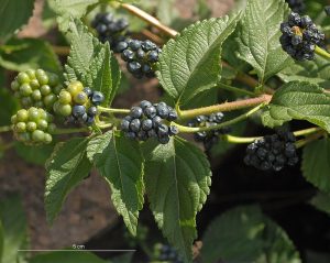 - Buah bergerombol di ujung tangkai, kecil, bulat, warna hijau ketika mentah, hitam kebiruan dan mengkilap ketika matang.