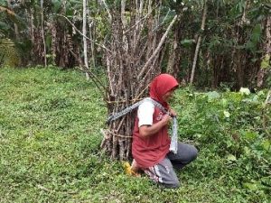 Ibu Pertimah (50 Tahun) asal Dusun Gombong yang sedang golek kayu bakar (mencari kayu bakar). Beliau biasa melakukan aktifitas ini setiap pukul 08.30 pagi dan kebetulan kayu yang diambil adalah kayu dari sisa penebangan pohon yang sudah tidak digunakan. Untuk cara mengambilnya hanya menggunakan tangan saja, karena kayu tersebut sudah kering dan mudah untuk dipatahkan. Dan terkadang juga menggunakan bendo (golok) utnuk mengambil kayunya. Setelah kayu terkumpul, lalu ikat menjadi satu menggunakan pelepah pisang yang sudah kering. Ibu Pertimah membawa kayu tersebut kerumah menggunakan jarik (selendang). Sesampainya dirumah, kayu tersebut digunakan untuk godok banyu (memasak air).