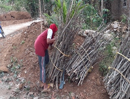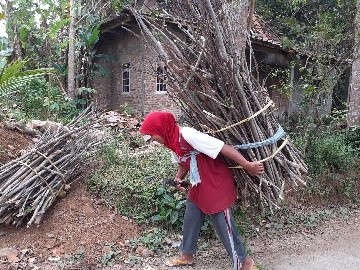 Ibu Pertimah (50 Tahun) asal Dusun Gombong yang sedang golek kayu bakar (mencari kayu bakar). Beliau biasa melakukan aktifitas ini setiap pukul 08.30 pagi dan kebetulan kayu yang diambil adalah kayu dari sisa penebangan pohon yang sudah tidak digunakan. Untuk cara mengambilnya hanya menggunakan tangan saja, karena kayu tersebut sudah kering dan mudah untuk dipatahkan. Dan terkadang juga menggunakan bendo (golok) utnuk mengambil kayunya. Setelah kayu terkumpul, lalu ikat menjadi satu menggunakan pelepah pisang yang sudah kering. Ibu Pertimah membawa kayu tersebut kerumah menggunakan jarik (selendang). Sesampainya dirumah, kayu tersebut digunakan untuk godok banyu (memasak air).