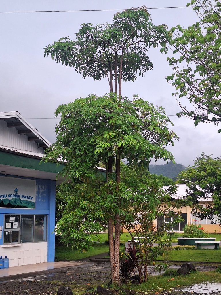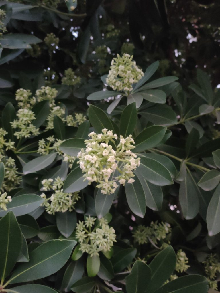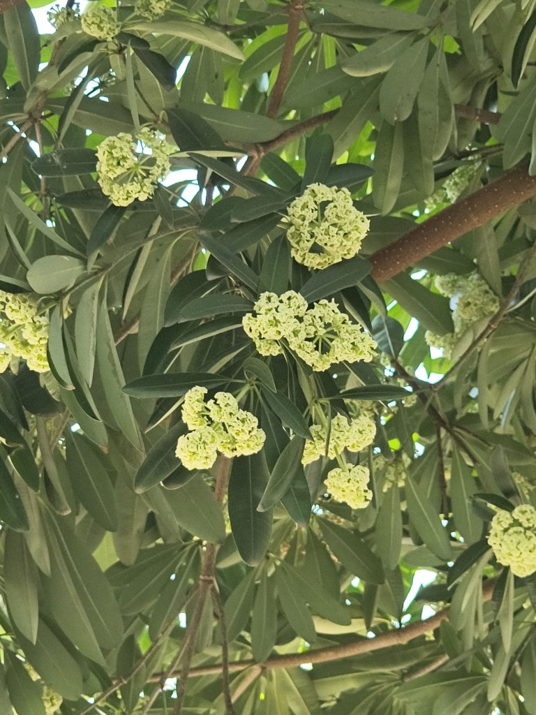 - Bunga biseksual, majemuk, mengelompok pada pucuk daun, kelopak bulat telur, putih kekuningan.