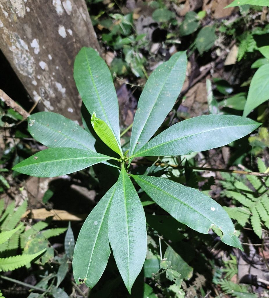- Daun bulat telur seperti spatula, ujung daun meruncing, hijau mengkilap dengan bagian bawah daun berwarna lebih pucat.
