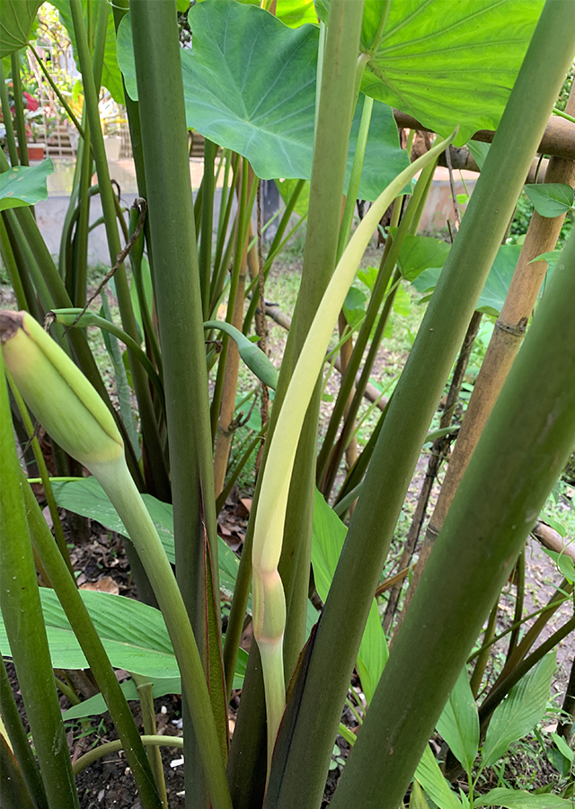 - Batang terbungkus pelepah daun dan berbentuk umbi, terletak di dalam tanah, cokelat agak kehitaman, berbulu-bulu halus.