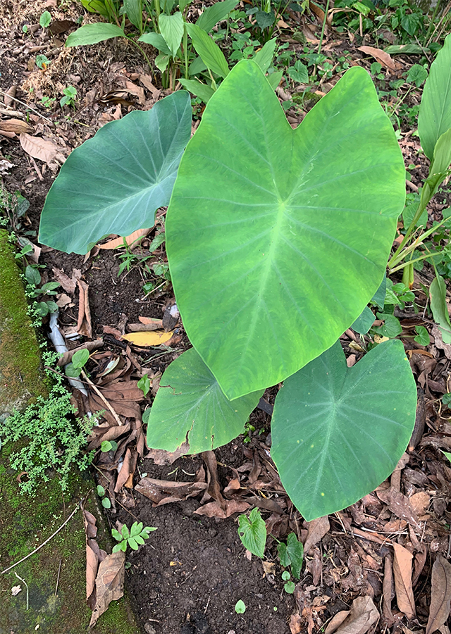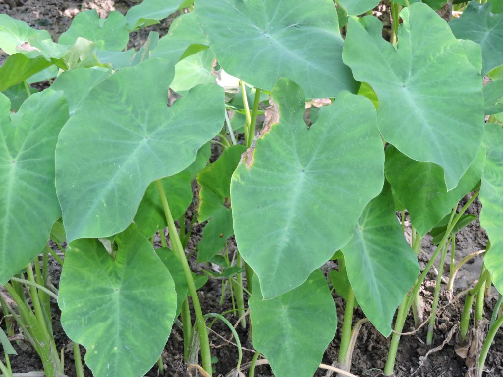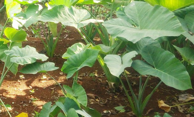 - Daun terdiri dari tangkai panjang, hijau, berbentuk jantung, ujung runcing, pertulangan menjari, helaian daun memiliki lapisan lilin. Terdiri dari 2–5 helai; dengan tangkai berwarna hijau, bergaris-garis hijau tua atau keunguan, 23–150 cm, pangkalnya berbentuk pelepah; helaian daun 6,60 × 7,53 cm, bundar telur, jorong, atau lonjong, dengan ujung meruncing, kadang-kadang berwarna keunguan di sekitar menancapnya tangkai, sisi bawahnya berlilin, taju pangkalnya membulat.