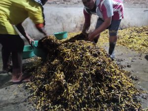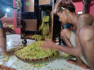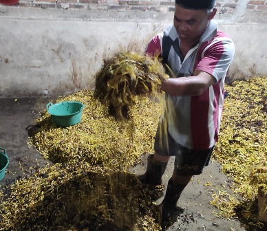 Setelah selelasi ngrajang, daun tembakau kemduian Diawut. Ngawut ialah proses pencampuran hasil rajangan untuk mencapai pemerataan karena warna daun tembakau yang bervariasi. Aktifitas ini bisa dilakukan oleh 1 orang atau lebih. Proses ini berjalan sangat singkat yang kemudian dilanjutkan ngeler daun tembakau oleh ibu-ibu yang selesai milehi.