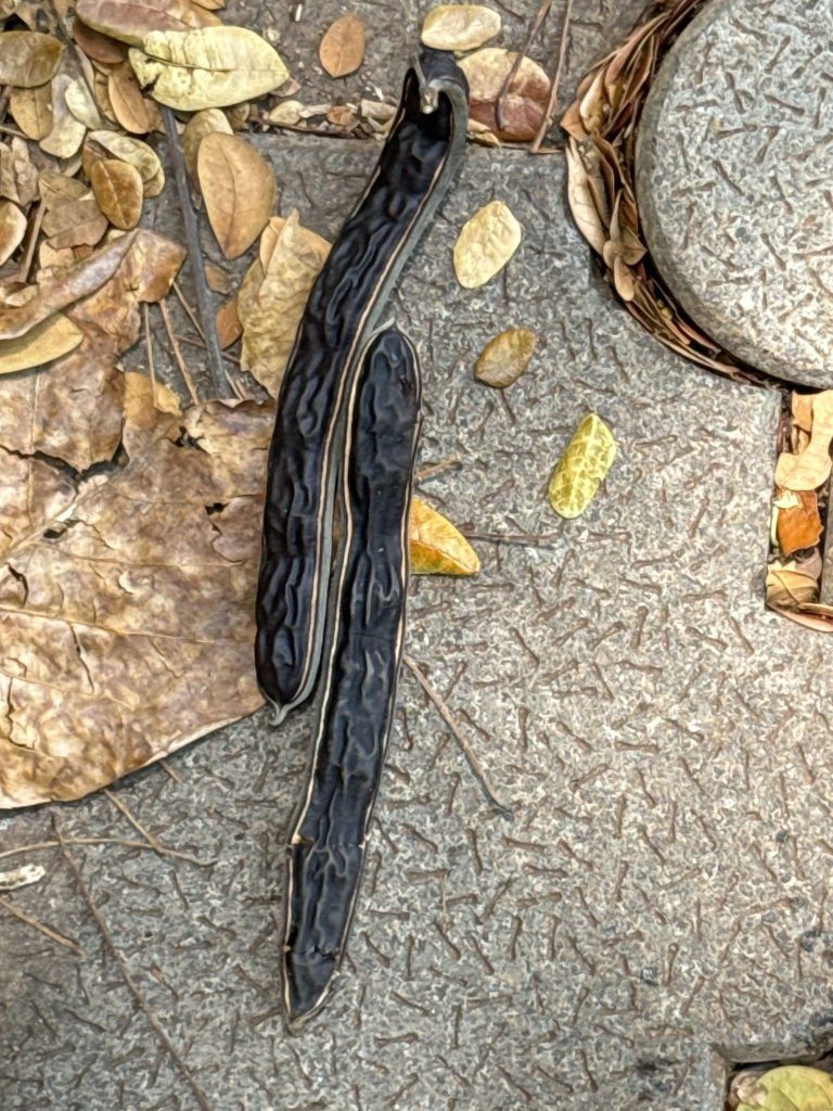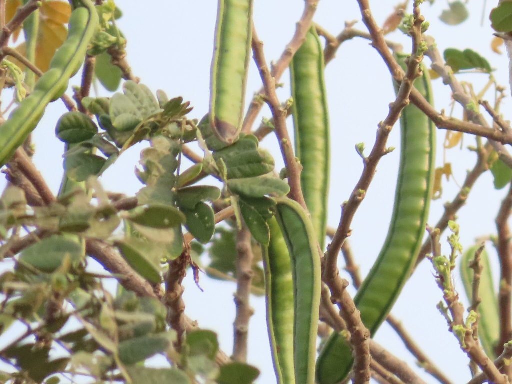 - Buah berbentuk polong melengkung, panjang 10–20 cm. Warna coklat gelap ketika matang. Daging buah lengket dan manis, disukai ternak. Mengandung 10–20 biji berbentuk lonjong kecil.